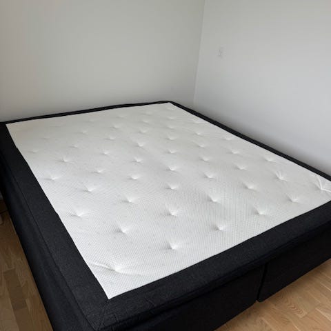 Ilva seng med madras. Dobbeltseng bestående af to madrasser placeret på en polstret sengebund. Neutrale, lyse tekstiler med kontrastkant. Egnet som seng i soveværelse eller gæsteværelse. Yderligere mål, materialer og hårdhed kan oplyses af sælger efter behov.