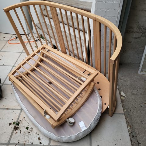 Den er blevet løs i nogle af tremmerne, men kan godt bruges når den er sat sammen. Eller uden tremmerne til større børn.