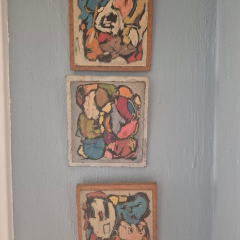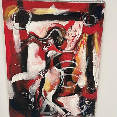 Svend Bruun akrylmaleri i kvadratisk format 40x40 cm. Motivet viser stiliserede figurer i øverste del af billedet og mørkere, abstrakte silhuetter i nederste del. Farverne er primært rød, sort og lysegrå/hvid. Malet på lærred med tydelig, struktureret overflade. Velegnet til ophængning i stue, entré eller kontor.