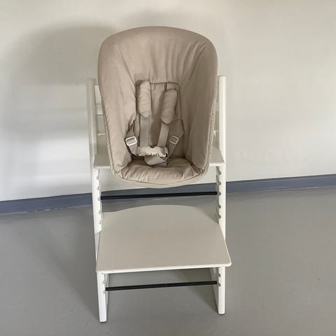 Hvid trip trap højstol med alt tilbehør. Står som ny. Kun brugt til børnebørn🥰