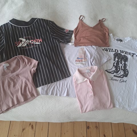 Her er alt, hvad der er populært for en pige i den alder og størrelse (Str- 152-164 eller XS): Motiv med diskokugle, Stitch eller high school, blonde- og hulmønstre samt flotte syninger. Der er to mørkeblå, to sorte, en rød, en lyseblå og en beige-farvet T-shirt. Mærkerne er: Pimkie, Garcia, FB Sister, Name it, Disney og H&M. Materiale er typisk bomuld eller bomuldsblanding. Sælges helst samlet for 100 kr., men kan også købes individuelt for 30 kr. pr. styk. Der gives også mængderabat ved køb af mere tøj og sko - bare spørg.