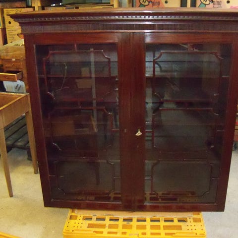 Reol i træ med åbne hylder og midtersektion med låge. Skabet har en bred topplade, der kan bruges til udstilling af service eller pyntegenstande. Indvendigt er der flere hylder til opbevaring af glas, kander, tallerkener eller andre køkken- og stueartikler. Egnet til brug i stue, spisestue eller køkken-alrum som opbevarings- og udstillingsmøbel.