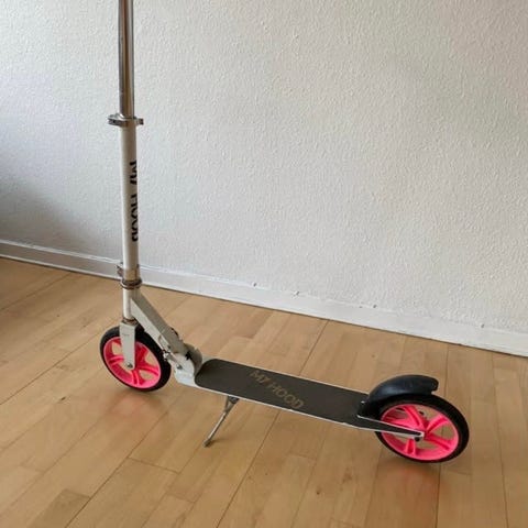 My Hood løbehjul i hvid med pink hjul. Klassisk kick-løbehjul med styr, fodplade og to hjul. Egnet til kørsel på jævne underlag, fx fortov og cykelsti. Passer til børn afhængigt af højde og vægtgrænse angivet af producenten.