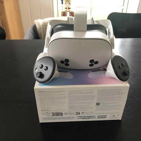 Meta Quest 3S VR-headset med controllere og oplader