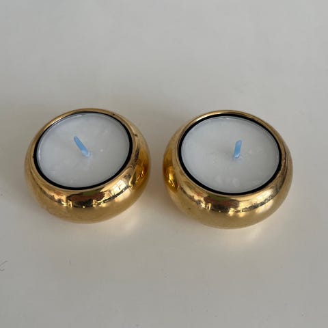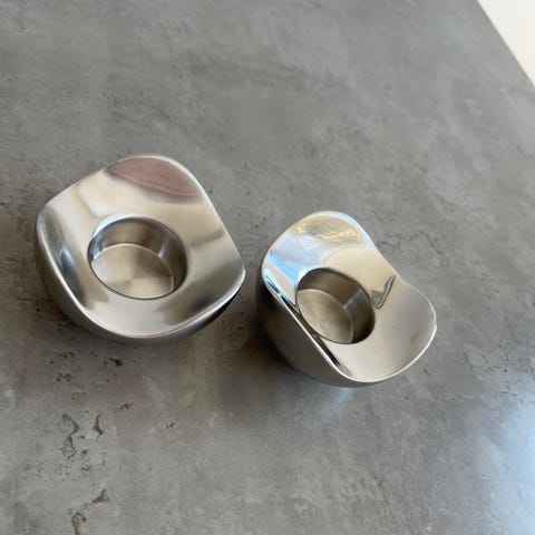 Georg Jensen fyrfadsstager i sølvfarvet metal. Sættet består af to stager med organiske, dråbeformede linjer og en rund fordybning til fyrfadslys. Overfladen er blankpoleret, og stagerne er velegnede til brug på bord, vindueskarm eller hylde. Designet giver plads til standard fyrfadslys.