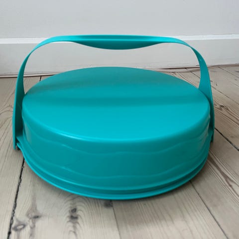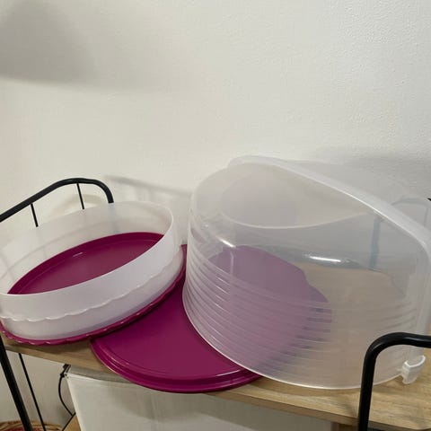Tupperware kageform i plast med tilhørende låg. Formen er rund med bølget kant og midterform, velegnet til fx budding, fromager eller gelé. Ydersiden er lys lilla, og låget er lyst. Produktet er beregnet til brug i køkkenet til fremstilling og opbevaring af desserter eller kager. Fremstillet i plast med Tupperware-logo præget i låget.