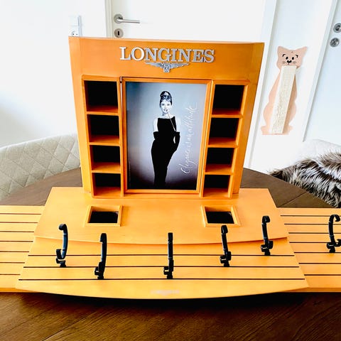 Longines urkasse til armbåndsure plads til 24 stk. Kassen har flere rum med individuelle puder til opbevaring af ure. Indersiden er lys og opdelt i separate sektioner, og ydersiden har en mørk ramme af træ med Longines-logo. Egnet til opbevaring og organisering af armbåndsure i hjemmet eller i en samling.