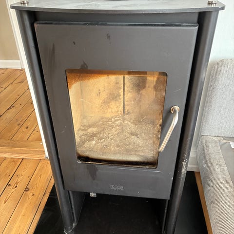 Cylindrisk brændeovn i sort stål. Ovnen har frontlåge med håndtag og reguleringsspjæld samt røgafgang i toppen for tilslutning til skorsten. Den står på en metalplade, som beskytter gulvet foran ovnen.