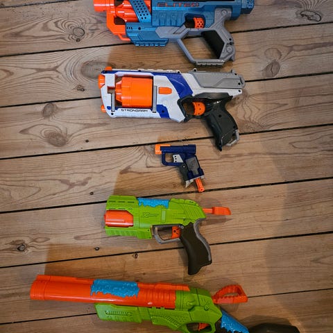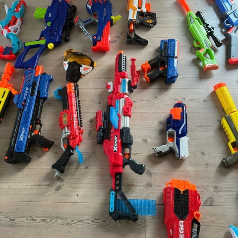 Nerf guns + andet mærke inklusiv Nerf målskive og Nerf briller. Dog uden patroner