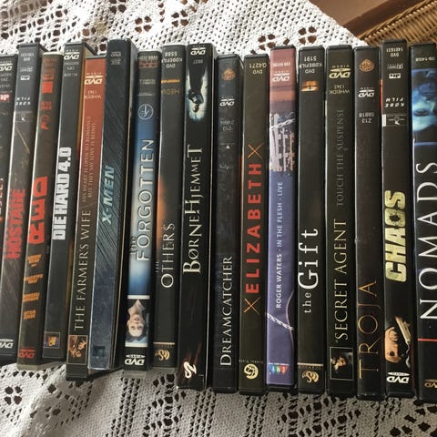 Blandet lot dvd film i papkasser. Flere forskellige titler og genrer, herunder både spillefilm og familiefilm. Dvd’erne leveres samlet i flyttekasser, som vist på billederne. Antal titler og specifikke film fremgår ikke fuldt ud af billederne og kan variere. Velegnet til dig, der ønsker en større samling dvd film samlet i én handel.