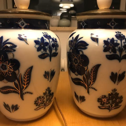 Porcelæn krukker med låg i sæt af to. Krukkerne er runde og udført i blå-hvidt porcelæn med blomster- og grenmotiver hele vejen rundt. Begge krukker har tilhørende låg med matchende dekoration. Velegnet som opbevaringskrukker eller som dekorative elementer i indretningen. Størrelse og producent er ikke angivet.