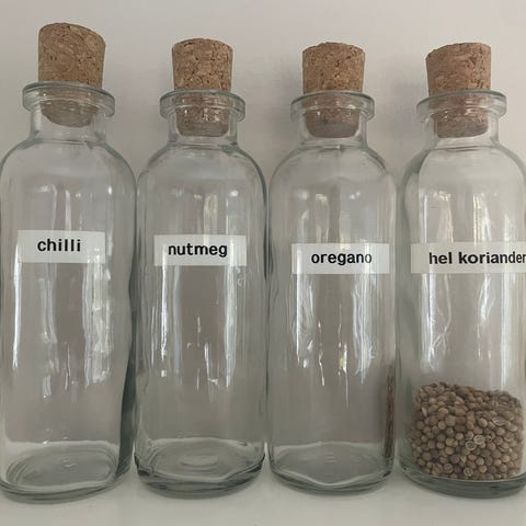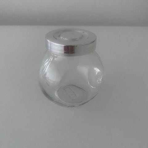 8 stk retro krydderiglas m/skruelåg, mørk plastik m/røde låg. H 7,5 cm - Ø 3,5 cm. Oprindelig tilhørende en boks med madopskrifter udgivet af Gutenberghus. Nogen har måske stadig denne boks, men mangler krydderiglassene. Der er navn på lågene: basilikum, cayenne peber, enebær, gurkemeje, merian, rosmarin, salvie, timian. Prisen er samlet for alle 8 glas.