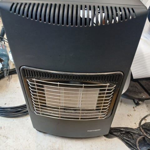 Ovnen fremstår i pæn stand med få brugsspor og ser ud til at være komplet med slange og regulator monteret. Den er på hjul og derfor nem at flytte rundt på i værksted, garage, fortelt eller lignende.