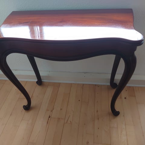 Halvmåneformet konsolbord i brunbejdset træ. Bordet har tre ben og lige bagkant til væggen.