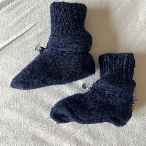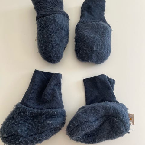 GoBabyGo skridsikre marineblå strømper i størrelse 6-12 måneder med gummi dutter under foden og ved tæerne. Rigtig gode kravlestrømper. Tyk bomuldskvalitet. Ikke brugt meget men har brugsspor. Kun vasket i neutral vaskemiddel.