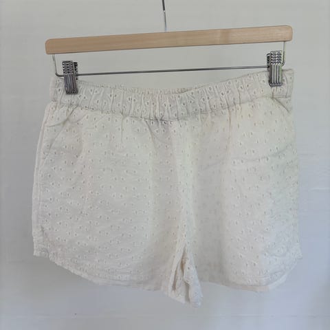 Lyse beige shorts i linnedblend med elastik i taljen og stiklommer. 52% linen, 45% viscose og 3% elastan. Str. 42, måler 48 cm i længden og 2x42 cm i livet. Mærket er gået løs i den ene side.