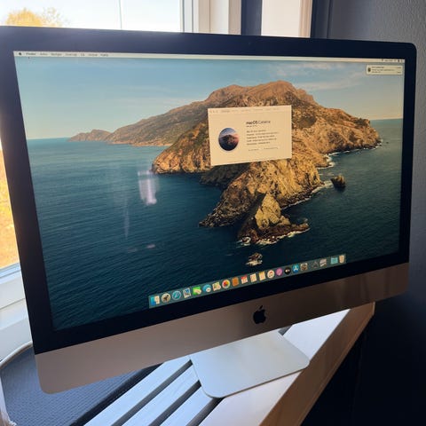 Apple iPad Air 2 og iMac 27" stationær computer med indbygget Retina-skærm på 27 tommer. iMac’en kører macOS Monterey og er udstyret med 8 GB RAM, som kan udvides via de ledige hukommelsespladser.