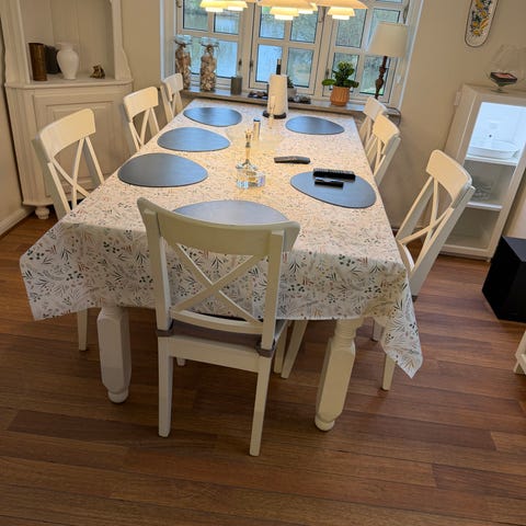 Spisebord Avignon Alsace lys massiv eg fra Idemøbler. 110 cm x 220 (320) inklusive to tillægsplader samt otte stole med hynder.