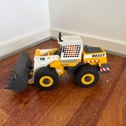 Bruder legetøjslæsseskovl i plastik. Modellen er udført i hvid og gul med røde hjul og sorte detaljer. Køretøjet har bevægelig læssearm og skovl, som kan hæves, sænkes og vippes. Kabinen har gennemsigtige ruder og detaljeret førerhus. Egnet som udendørs og indendørs entreprenørlegetøj til børn, der leger med arbejdsmaskiner og byggeplads. Fremstillet i robust plastmateriale, der tåler almindelig leg.