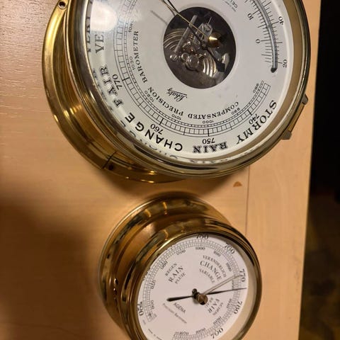 Barometer i messing til vægmontering. Rund model med hvid urskive og markeringer for vejrtype som "rain", "change" og "fair". Forsiden har glasafdækning og messingramme med skruehuller til montering. Bagsiden er lukket med metalplade mærket med tallet 1001. Velegnet som analogt måleinstrument til visning af lufttryk og vejrudvikling i hjem eller båd.