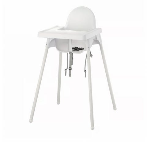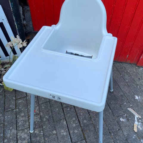 IKEA højstol i hvid plast med aftagelig bakke og grå metalben. Stolen har integreret sikkerhedssele. Højstolen er velegnet til små børn ved spisebordet og kan nemt skilles ad for opbevaring eller transport.