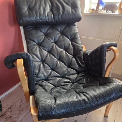 Klassisk skandinavisk design med flot buet træstel og sort læder.