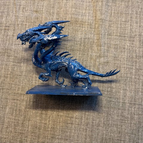Original Miniature fantasivogn i metal fra 1987 med pigge og hjul samt tilhørende små figurer. Sættet består af en vogn og flere løse figurer i metal, hvor én figur er delvist malet i rød.