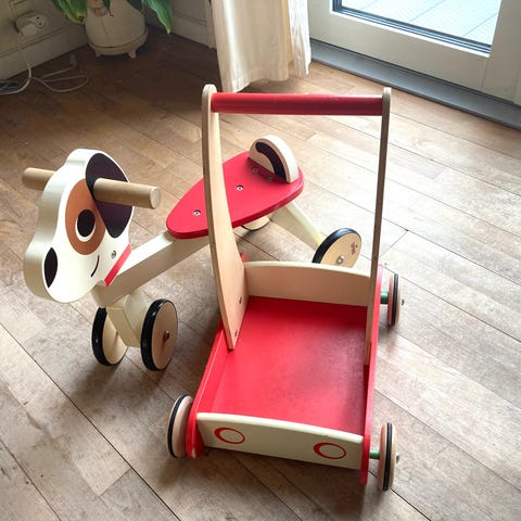 løbecykel udformet som en hund i træ. Cyklen har fire hjul for stabilitet og et fast styr i træ. Sædet er rødt, mens stel og hundemotiv er i lyse og mørke nuancer. Velegnet som gå- og løbecykel til mindre børn, der øver balance og motorik indendørs eller på jævne underlag.