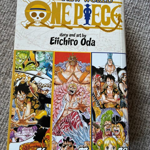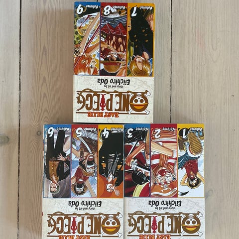 One Piece manga bøger med bind 1-9 af Eiichiro Oda. Samlingen består af tre bøger, hvor hver bog indeholder tre sammenhængende bind: 1-2-3, 4-5-6 og 7-8-9. Sort-hvid manga på trykpapir med original japansk tegnestil og engelsk tekst. Serien følger karakteren Luffy og hans besætning i begyndelsen af One Piece-historien i East Blue-arkens fortælling.