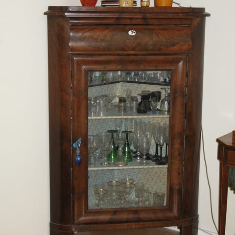 Fint hjørneskab med buet front. Øverst et rum med to hylder og buet låge. I midten et lille rum med to buede skydelåger, flankeret af to stor søjler. Nederst et større rum med buet låge. Begge låger er udstyret med låse og nøgler der virker. Skabet hviler på en sokkel med to søjler.