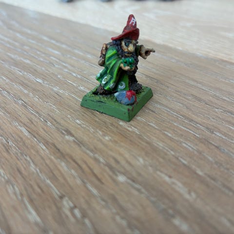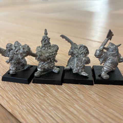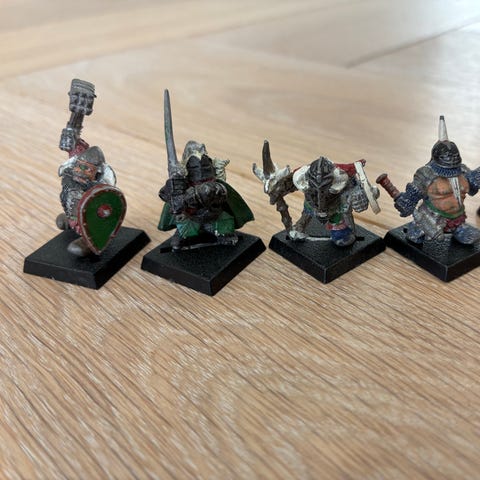 Warhammer dværge metalfigurer til bordspil. Sættet består af fire dværgeminiaturer i metal på firkantede plastikbaser. Én figur er delvist malet, de øvrige er umalede.