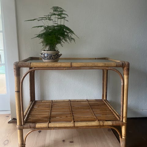 Velholdt bambusbord med glasplade sælges. Bordet er forsynet med avishylde, og er uden synlige skader.