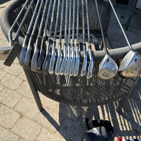 Cleveland golfkøller med bag sæt. Sættet består af flere jernkøller og køller med større køllehoveder samt en stående golfbag i gul og sort med flere rum og bærestropper. Der medfølger desuden headcovers og et sort overtræk. Velegnet som komplet sæt til golfspillere, der ønsker et samlet udvalg af køller med tilhørende bag.