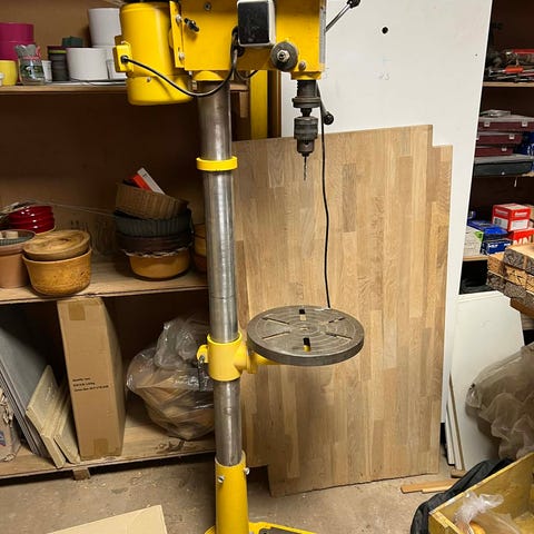Power Craft 214750-1 søjleboremaskine med 250 W motor. Drift ved 230 V / 50 Hz. Maskinen har lodret søjle, borehoved med håndtag til nedføring af boret samt bord til emnefastspænding. Egnet til boring i træ, plast og metal i hobbyværksted eller mindre værksteder. Grøn kabinetfarve med betjeningsknapper placeret på siden af maskinen.