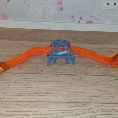 Hot Wheels racerbane i plast med flere loops og kurver. Banen består af blå, orange og grønne banedele samt en base med Hot Wheels-logo. Egnet til brug med standard Hot Wheels-biler i metal eller plast. Velegnet som legetøj til børn, der kan lide bilbaner og konstruktionssæt. Der er batteri i så den selv kan skyde bilerne igang💕