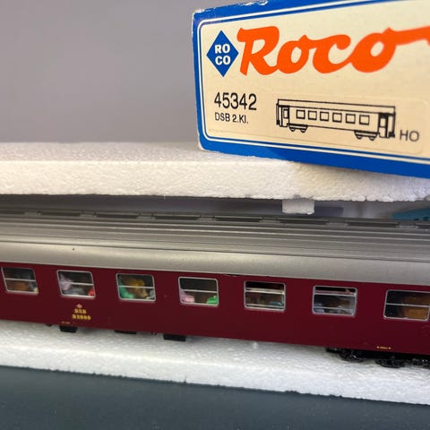 ROCO 45337. Super flot model af DSB's legendariske brune B-vogne - her DSB BD 51 86 82-80 004-1. Pak og 2. klasses vogn. Vognen har indbygget LED paneler, passagerer, kondensator for at undgå blink - og slæbesko samt strømførende koblinger i begge ender. Der følger ekstra tag med i den originale stål-grå, hvis man ikke kan li' mit mere naturtro, sorte tag.