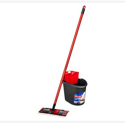 Sæt bestående af fladmoppe med teleskopskaft, spand, udvrider og et enkelt moppestykke (kan vaskes på 60 grader).