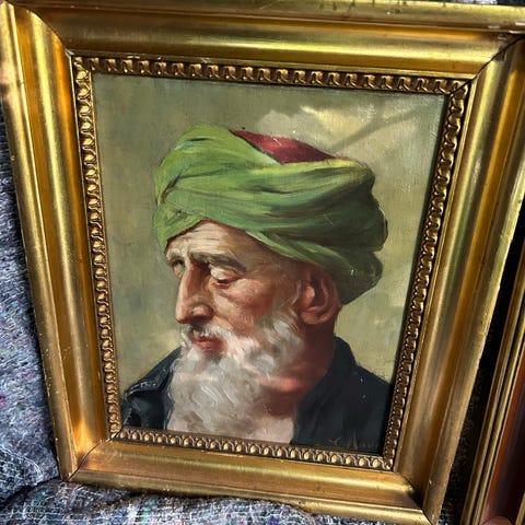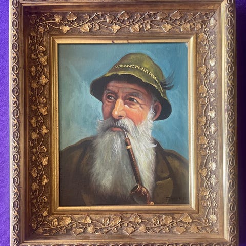 Oliemaleri af ukendt kunstner, der forestiller en ældre mand med skæg og pibe iført hat og frakke. Maleriet er udført på lærred og indrammet i en profileret guldfarvet ramme. Motivet er et klassisk portræt i varme, dæmpede farver. Velegnet til ophængning i stue, gang eller kontor som dekorativ vægudsmykning.