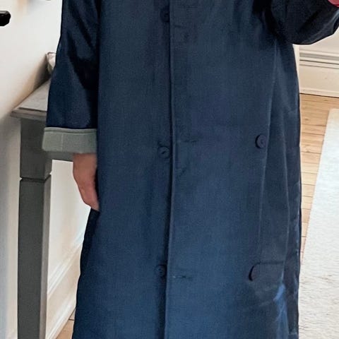 Wood Wood jakke til kvinder i str. S. Jakken er i blå cordfløjl med dobbeltknaplukning foran. Den har høj krave, elastik ved hofte og ærmeafslutninger samt skrålommer i siderne. Indersiden har mønstret foer. Velegnet som overgangsjakke eller let yderjakke.