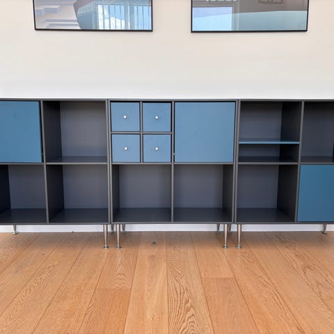 Kubik Color TV-møbel i to sektioner. B: 140 cm, D: 32 cm, H: 34,5 cm. Farven er antracit med blå låger.