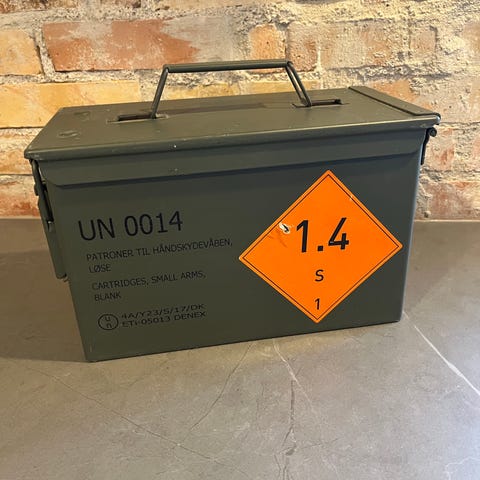 Militær ammunitionskasse i metal i grøn farve. Kasserne er robuste og er oprindeligt fremstillet til opbevaring og transport af ammunition. De har hængslet låg med låsemekanisme og bærehåndtag i siden/toppen. Velegnet til opbevaring af værktøj, udstyr eller andre genstande, hvor der ønskes en solid metalbeholder. Tekst og mærkninger på siderne angiver oprindelig militær specifikation og kapacitet.