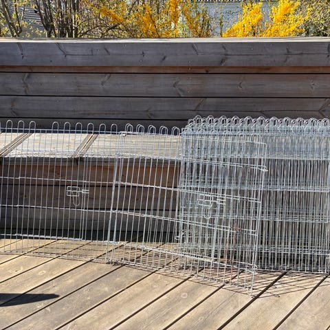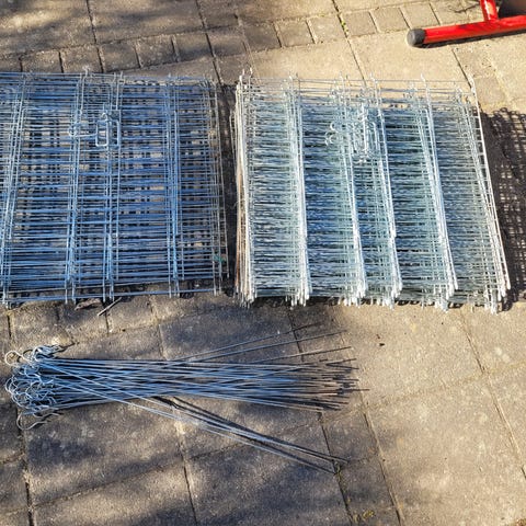 Trærammer med trådnet, velegnet som udendørs sektioner, fx til indhegning eller afskærmning i have eller gårdmiljø. Rammerne består af lægter med fastmonteret net og kan anvendes som elementer i et hegn eller en løbegård. Mål 188 x 167.5 cm og 192 x156 cm. 75 kr. pr stk.