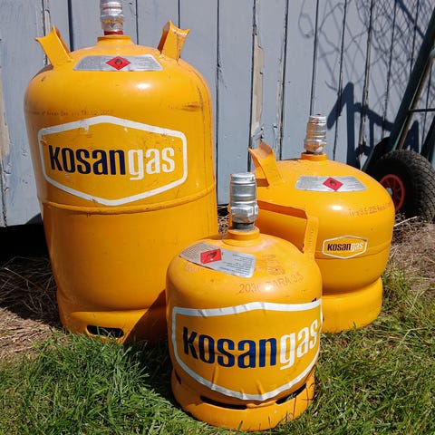 2 kosangas-flasker 11 kg, den ene fyldt og plomberet, den anden taget i brug. Samt en flaskevogn. Sælges samlet for 500 kr. Ellers henholdsvis 300 kr. og 200 kr. og 50 kr. for flaskevognen.