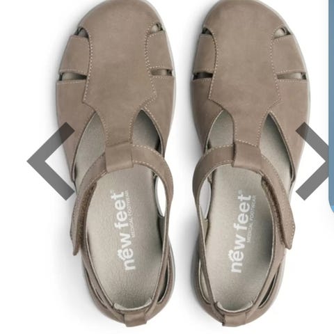 Damesandaler fra New Feet str. 38, næsten ikke brugt. Velcroremme i hæl og 3 på tværs af foden gør det meget let at indstille sandalen, så den passer til både højre- og venstrefod.