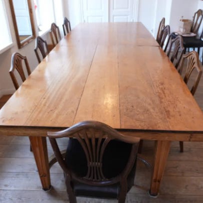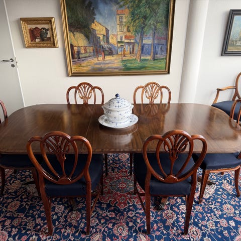 Flot fransk landspisebord i egetræ med 6 stole til. Ca. 150 år gammelt