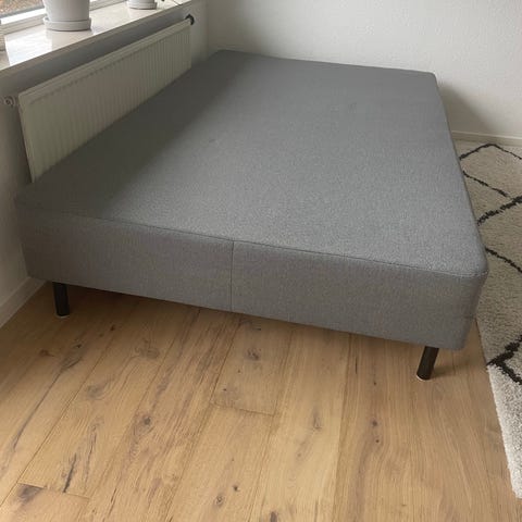Jysk seng i grå. Sengen har en enkel, moderne stil med mørkgrå tekstil på ramme. Opbevaring indeni, ved løft af top.