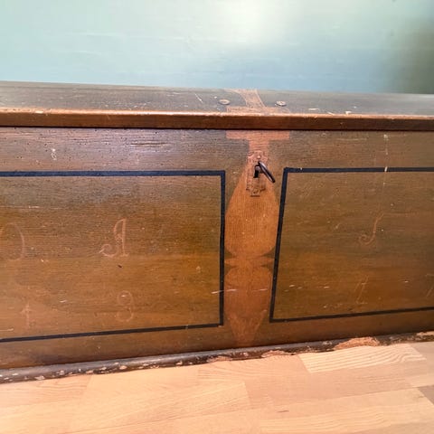 Antik kiste betrukket med dyb rødt stof. Kan både anvendes til opbevaring og som siddeplads.