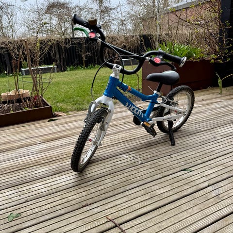 Lilla og hvid Woom børnecykel (st. 3.) med 16 tommer hjul. Cyklen er fra juli 2024. Den er brugt, men i rigtig god stand. Den har stået under halvtag.