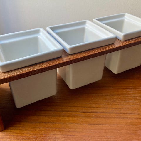 Trip Trap tapas-sæt bestående af tre kvadratiske hvide porcelænsskåle i holder. Skålene står i et massivt egetræsstativ med tre udskæringer, så de kan tages op enkeltvis. Velegnet til servering af tapas, snacks, dip eller til krydderurter på bord eller køkkenbord. Designet kombinerer hvidt porcelæn med lyst egetræ for et enkelt og funktionelt udtryk.