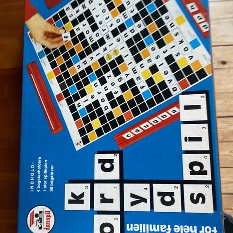 Krydsord, strategi/familiespil, brætspil, Ældre krydsordspil fra KE leg med spilleplade, 98 bogstaver og 2 jokere, der kan gå for alle bogstaver. Spilleregler er anført inden i låget. Der er fire bogstavholdere, så det er muligt at spille fire personer.